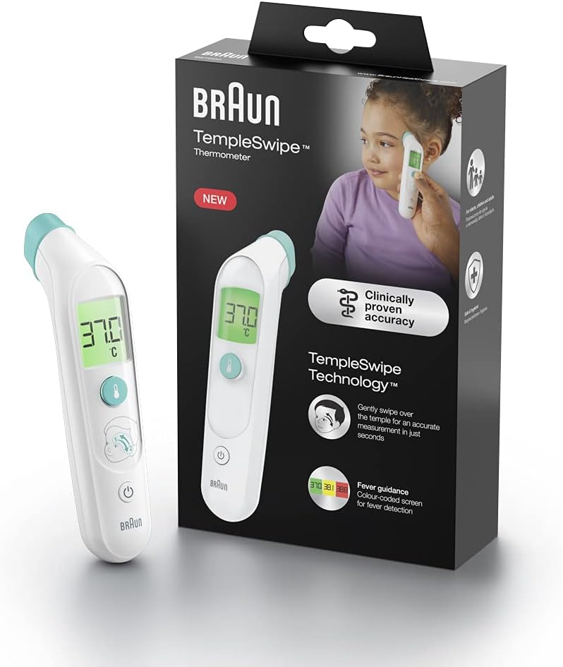 The Braun TempleSwipe thermometer is a reliable and accurate device that has been clinically proven to provide accurate temperature readings. With its non-invasive and gentle TempleSwipe(TM) Technology, the Braun thermometer provides a quick and accurate temperature reading without causing discomfort or distress. This makes it ideal for use on all ages, including newborns. The thermometer features a colour-coded fever guidance system that allows you to quickly identify if someone has a fever or not, and how high it is. The display shows green, yellow or red, making it easy to interpret the readings. The Braun TempleSwipe thermometer is designed with safety in mind, featuring no glass or mercury, making it safe to use for both adults and children. Additionally, it is easy and convenient to use, with a simple swipe of the thermometer over the forehead providing a fast and accurate reading. The thermometer is suitable for all ages, including newborns. Its gentle and non-invasive technology makes it an excellent choice for parents who want to monitor their child's temperature without causing discomfort or distress. Additionally, it can be used on adults and seniors for quick and accurate temperature checks. Overall, the Braun TempleSwipe thermometer is a reliable and easy-to-use tool that helps you monitor your family's health with confidence.