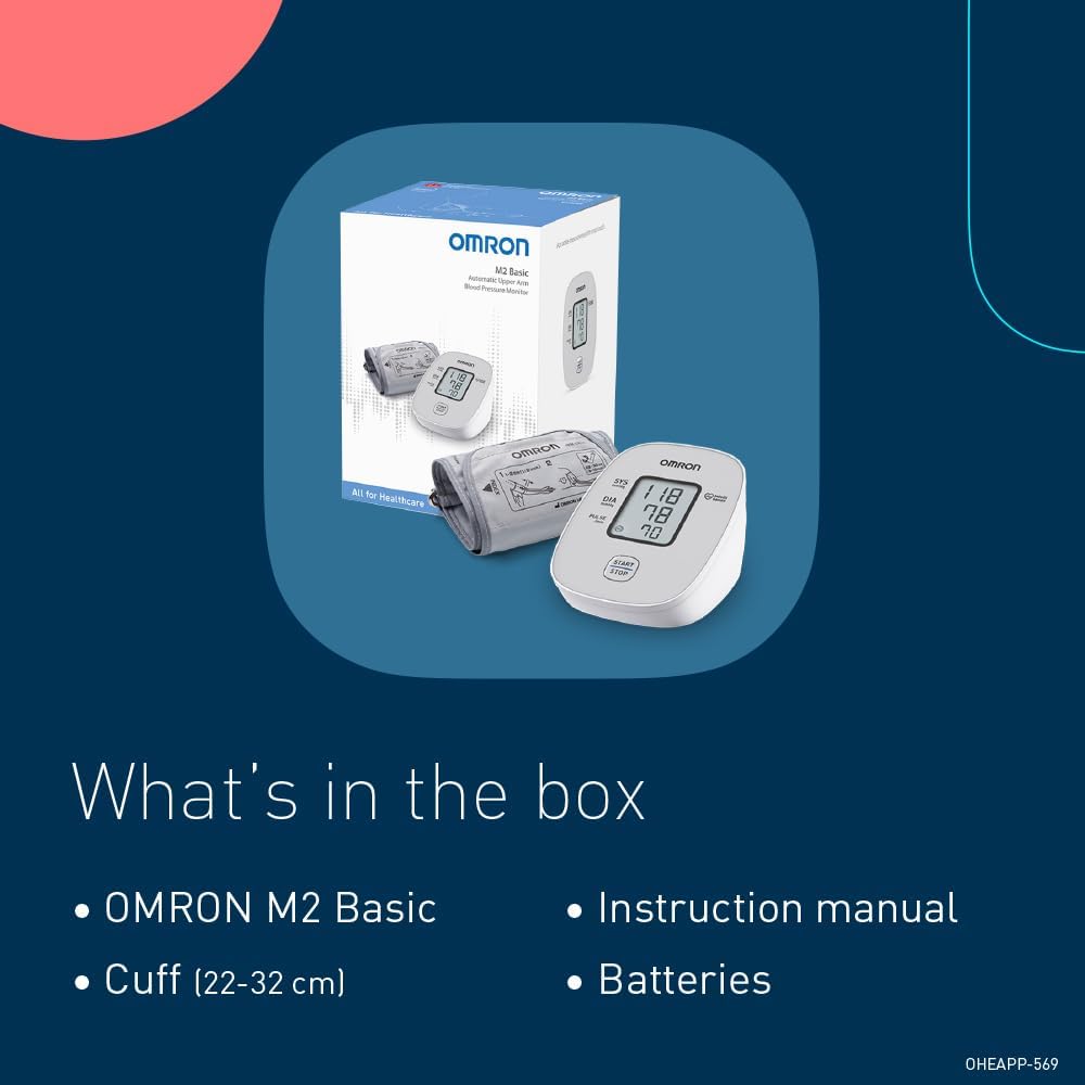 - 5 YEAR GUARANTEE: OMRON offers an industry-leading 5 years guarantee terms for all blood pressure monitors, giving its users a best high-grade product for the long-term. ITEMS INCLUDED: 1 x OMRON M2 Basic blood pressure monitor with a medium size (22-32 cm) upper arm cuff, 4 x AA batteries, instruction manual
